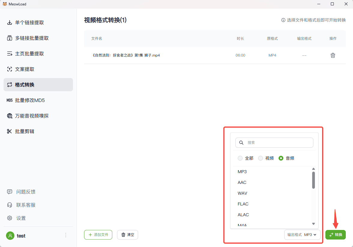 下载的视频格式打不开?或者想把视频转成音频听播客?MeowLoad 内置了强大的转换引擎,无需额外安装繁琐的软件,即可在视频、音频、图片之间自由切换。